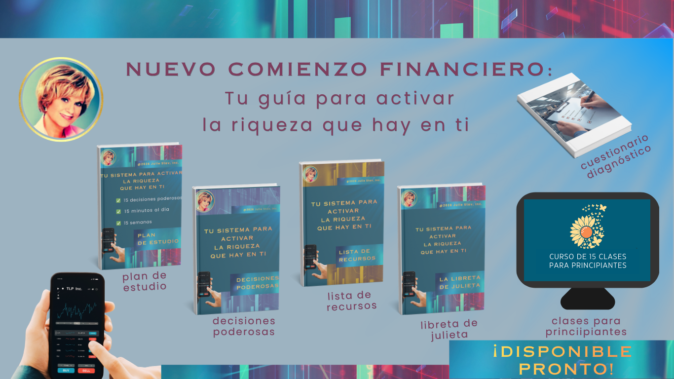 El rendimiento histórico de los valores bursátiles, estrategias de inversión y/o productos/servicios discutidos o de los que se hace referencia no deben considerarse como un indicador o garantía de éxito o desempeño futuro. Los valores bursátiles y/o estrategias de inversión discutidas o de los que se hace referencia en este seminario/documentos pueden ser “inadecuadas para algunos inversionistas, ya que pueden implicar un riesgo sustancial de capital, ser especulativas y conllevar costos de transacción. Los participantes deben tomar sus propias decisiones al invertir, basadas en sus objetivos personales, situación financiera y fiscal. Julie Stav, Inc. y sus representantes no dan recomendaciones de inversión ni de estrategias específicas y no se hacen responsables por cualquier decisión financiera que usted decida tomar. No hay sustituto para el análisis exhaustivo de un valor bursátil antes de invertir.